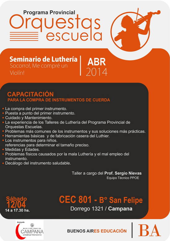 El próximo sábado 12 de abril a partir de las 14 horas, en la sede de la Orquesta-Escuela de Campana se realizará una Capacitación Regional en Luthería dirigida a todos los alumnos, padres, familias y público en general que estén interesados en asistir.