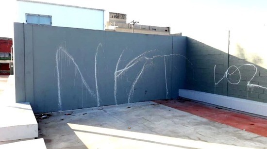 Desconocidos pintaron el muro perimetral de la plaza que se encuentra en plena construcción.