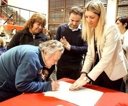 El intendente Sebastián Abella acompañado de la escribana Carolina Barassi le toman la firma a una de las 40 vecinas que pronto contará con la escritura de su vivienda