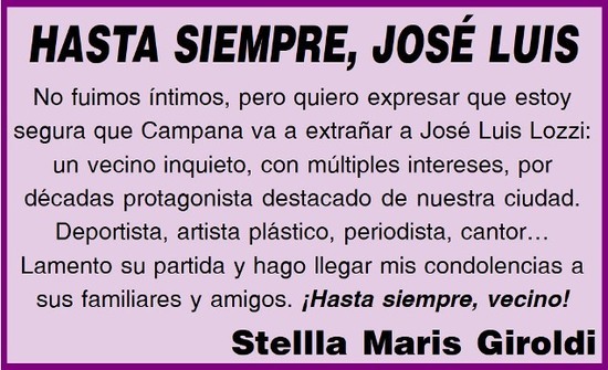 Su firma supo también estar presente estas páginas, desde las cuales acompañamos sentida-mente a familiares, amigos y allegados. Seguramente, José Luis ya estará animando alguna peña tanguera en algún rincón del cielo.
