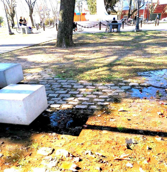 "Intensa pérdida de agua en Plaza Italia, cercana a mesas y juegos.." muestra Susana.