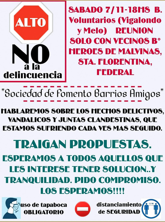 "A pedido de los vecinos de Santa Florentina, Malvinas y Federal y debido a los hechos delictivos que se registran con bastante frecuencia en estos barrios (hemos convocado la reunión", comentó Gabriel Panno, titular de la sociedad de fomento. Las modalidades que más se estarían. incrementando son los motochorros y la irrupción violenta en los hogares, llevándose lo que encuentran a mano.