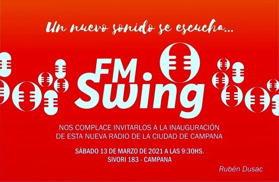 Tras varios días de transmisión de prueba y ajustes, hoy por la mañana tendrá lugar la inauguración oficial de FM Swing, en el 107.5 del dial. Se trata de la nueva radio montada por Rubén Dusac cuyos flamantes estudios se encuentran en Sivori 183.