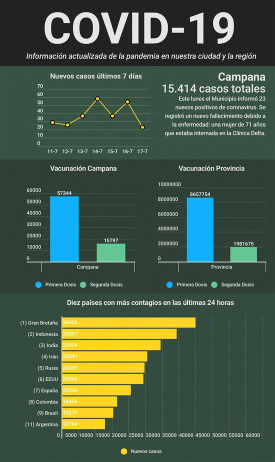 De esta manera, la estadística sanitaria de julio acumula 24 decesos por Covid en Campana, que ahora totaliza 291 víctimas fatales desde el inicio de la pandemia (la tasa de letalidad se encuentra en 1,89%).