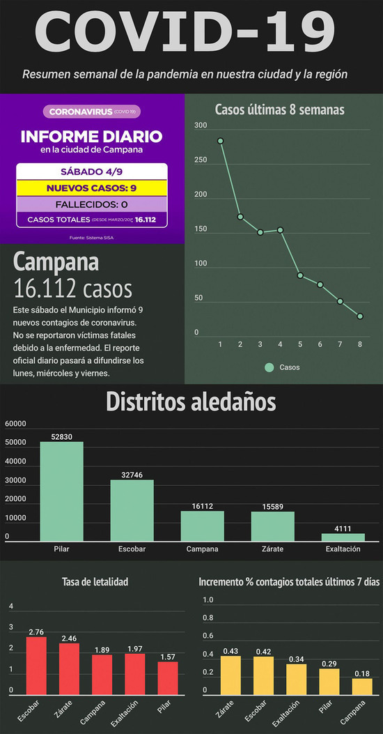 En este contexto, desde la Municipalidad de Campana señalaron ayer que, en adelante, solo se brindarán tres partes por semana sobre la situación del coronavirus en la ciudad. "Ante la baja sostenida de casos se difundirán los lunes, miércoles y viernes", se explicó sorpresivamente.