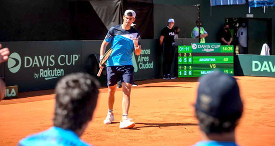 La primera jornada de la serie de Copa Davis entre Argentina y Bielorrusia culminó en un sorpresivo empate, luego que Daniil Ostapenkov (junior de 18 años sin partidos en el circuito mayor) venciera 6-4 y 6-3 a Diego Schwartzman (N° 15 del ranking mundial y Top 10 poco tiempo atrás). Tras esa derrota del Peque, el bahiense Guido Pella (foto) sí cumplió con la lógica y niveló el duelo al superar 6-1 y 6-2 al también juvenil Erik Arutiunian (16 años). La acción continuará hoy en el Buenos Aires Lawn Tennis Club y el dobles conformado por Horacio Zeballos y Máximo González será el encargado de tratar de poner en ventaja al equipo capitaneado por Gastón Gaudio. Posteriormente se invertirán los singles disputados ayer para definir la serie que determinará qué país compite el año próximo en el Grupo Mundial.