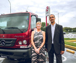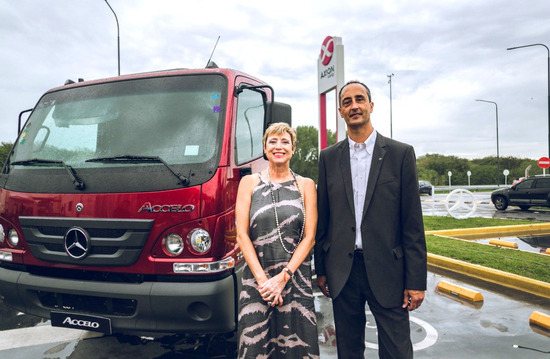 Sandra Yachelini, vicepresidente Comercial y Marketing de AXION energy y Raúl Barcesat presidente de Mercedes-Benz Camiones y Buses, en la recientemente inaugurada estación de servicio de Ituzangó, donde se firmó la alianza entre ambas compañías.