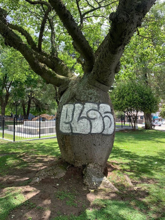 El "palo borracho" de la plaza Eduardo Costa fue pintado con aerosol.