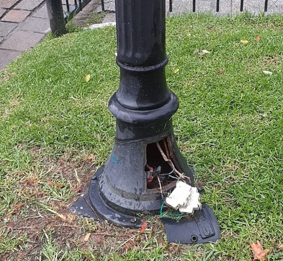 #QuejaVecinal vecinos de barrio Catema reclaman falta de mantenimiento en las bases de las farolas de la plaza 1° de Mayo, principalmente del lado del Sakate Park. Textualmente: hace meses que hay varias columnas de alumbrado sin la tapa, con los cables expuestos. @CeMAV_Campana pic.twitter.com/dSCB6k8RTg