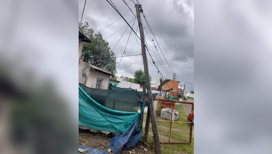 "Hola buenas tardes. Este palo de luz está apoyado contra mi portón. No solo está a punto de caerse, sino que además cuando llueve o hay viento hace un chisperío impresionante y el portón es de metal. Nadie me da una solución. Está en calle Salmini entre Lopez y Planes y Switzer del Barrio San Felipe", explica Agustín.