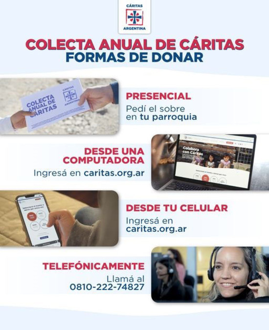 Podés donar en tu parroquia con el sobre de Cáritas, a través de tu computadora o celular ingresando en www.caritas.org.ar o llamando al 0810-222-74827. Es una oportunidad no sólo para compartir los bienes, sino también la esperanza de construir un futuro inclusivo para todos, comenzando por las acciones y el compromiso de cada uno de nosotros con el presente.