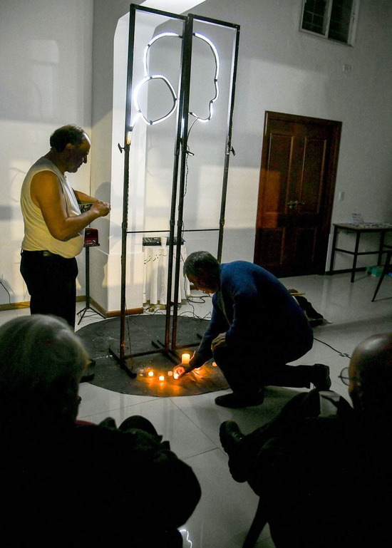 Carlos Ortega ofrenda una vela encendida a la imagen lumínica de Eva Perón, que fue parte del decorado de la obra.