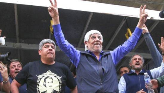 "Vamos a demostrarle a estos señores que con los trabajadores no se juega", agregó -acompañado por su hijo y secretario adjunto, Pablo Moyano, en referencia a los empresarios.