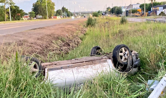 Un automóvil Chevrolet Corsa Classic quedó ruedas arriba en un zanjón contiguo a la ruta 6, luego de perder el control de su vehículo al evitar colisionar con una motocicleta que se le cruzó en plena marcha.
