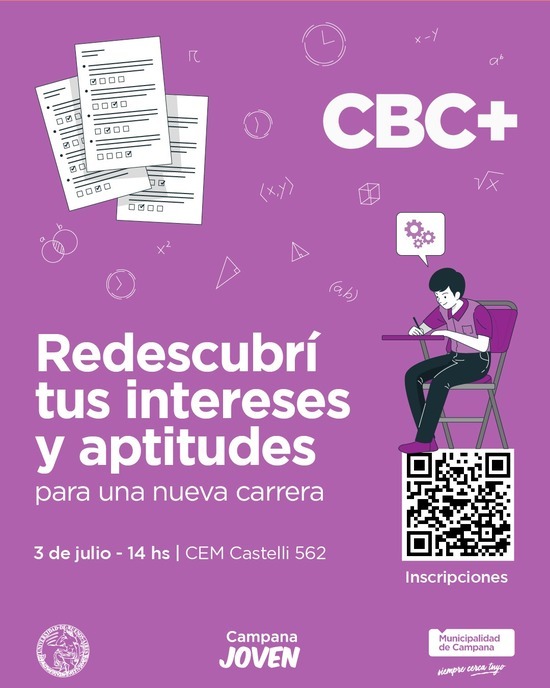 La propuesta de reorientación vocacional del Municipio está enmarcada dentro del programa CBC+ y se realizará el lunes 3 de julio a las 14 en el CEM (Castelli 562) con entrada libre y gratuita. Se requiere inscripción previa.