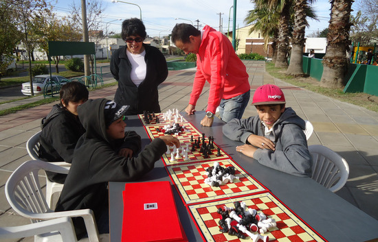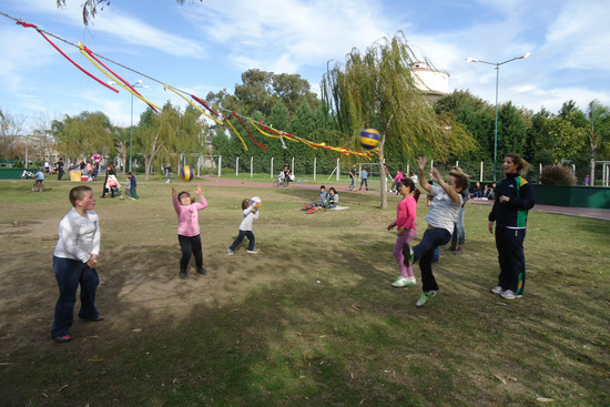 En la soleada tarde del sábado 1º de junio, la Directora de Deportes, Lic. María Julia Albarellos, invitó a chicos y grandes que llegaban al Parque Urbano a disfrutar de clases abiertas y gratuitas de gimnasia, voley y ajedrez.