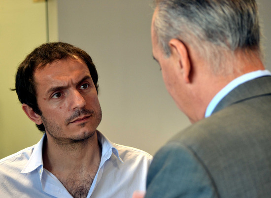 Abella dialogando con uno de los integrantes del equipo de asesores que esta trabajando en formalizar un plan integral para la ciudad.