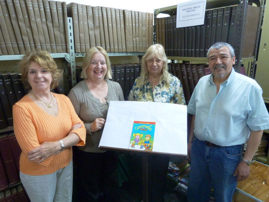 La Coordinadora de la Institución Bibliotecaria, Marta Magistratti, junto a la escritora e integrantes de Campana Amanecer Literario.