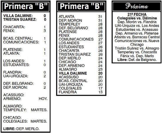 En el complemento, ambos equipos contaron con chances de abrir el marcador, pero fue Villa Dálmine el que tuvo en los pies de sus delanteros las más claras pero en todas les faltó puntería para terminar de transformarlas en gol.