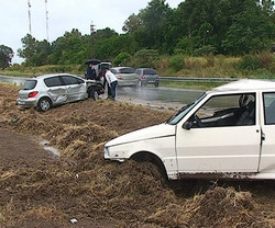 En horas de la mañana de ayer y en plena tormenta se produjo un violento choque entre dos autos en la zona de la rotonda de Las Acacias sobre Ruta 6.