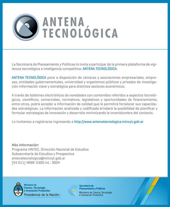 La "Antena Tecnológica" brinda información y novedades tecnológicas para diferentes sectores productivos y es desarrollada de manera conjunta por la Secretaría de Planeamiento y Políticas del Ministerio de Ciencia, Tecnología e Innovación Productiva de la Nación, a través del Programa VINTEC y la Unión Industrial Argentina.