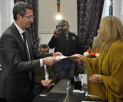 El acto protocolar se realizó en el Despacho Principal del Palacio Municipal y contó con la presencia del Secretario de Gabinete, Arq. Claudio Rodríguez; la Subsecretaria de Producción, Turismo, Ciencia y Tecnología, Ing. Adriana Fea y la Directora de Producción y Turismo, Dra. Gabriela Franco.