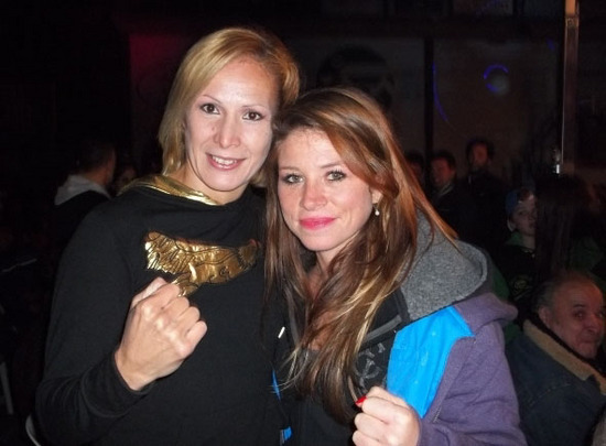 BELLAS PELEADORAS. YÉSICA BOOP JUNTO A "LA PEKE" Y CAROLINA DUER, MÁS DOS PÚGILES QUE ASISTIERON A LA VELADA.