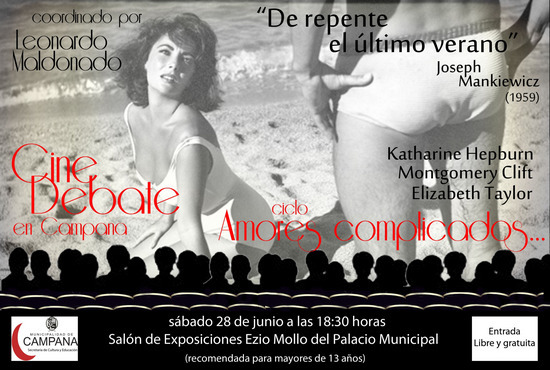 Este sábado 28 de junio a las 18.30 hs se proyectará el film "De repente el último verano" (Suddenly last summer, 1959), dirigido por Joseph L. Mankiewicz, en el marco del ciclo de Cine Debate "Amores Complicados" auspiciado por la Secretaría de Cultura y Educación de la Municipalidad de Campana y coordinado por el licenciado Leonardo Maldonado. Se trata de uno de los últimos grandes films de estudio hollywoodense. Basada en la obra de teatro homónima del dramaturgo Tenneesee Williams, la película está protagonizada por tres grandes estrellas de entonces: Katharine Hepburn, Montgomery Clift y Elizabeth Taylor.