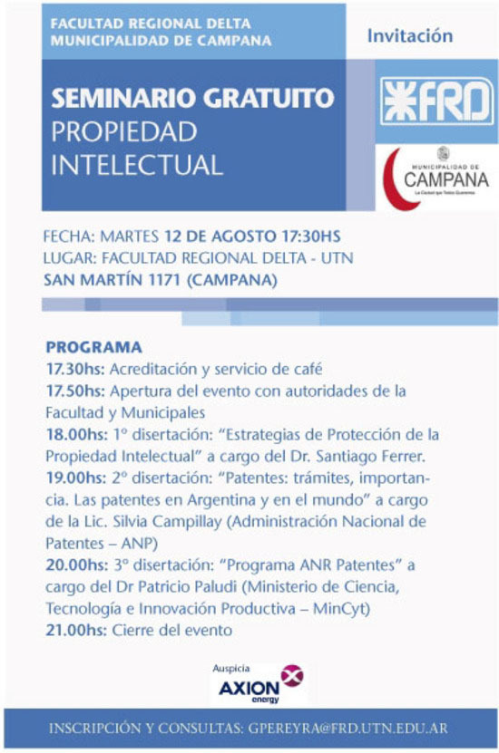 De manera articulada entre el Municipio de Campana, por intermedio de su Subsecretaría de Producción, Turismo, Ciencia y Tecnología, y la Universidad Tecnológica Nacional, Facultad Regional Delta, con el auspicio de la Empresa Axion energy, llevarán adelante el Seminario sobre Propiedad Intelectual.
