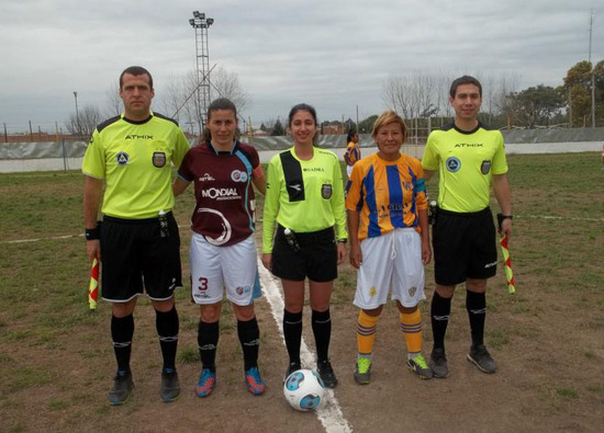 LAS CAPITANAS INDIANA FERNANDEZ Y MARIA RODRIGUEZ, POSANDO CON LA TERNA ARBITRAL.