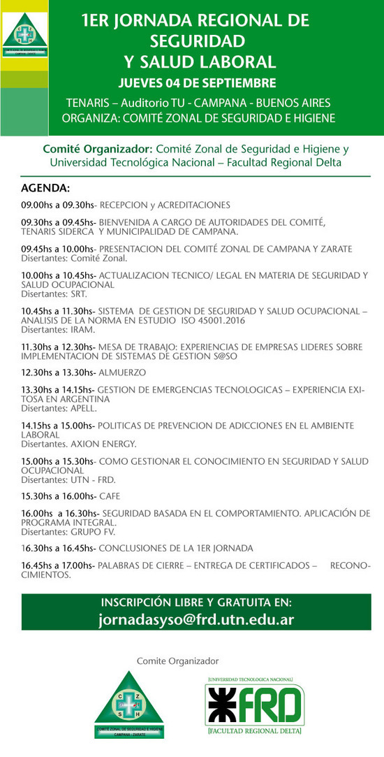 El próximo jueves 4 de septiembre, a partir de las 09:30 horas, y extendiéndose hasta aproximadamente las 18 horas, se estará desarrollando la 1º Jornada Regional de Seguridad y Salud Laboral, evento organizado por el Comité Zonal de Seguridad e Higiene y la Universidad Tecnológica Nacional, Facultad Regional Delta.