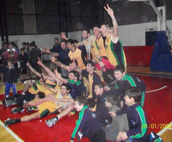 TODO EL PLANTEL DE CIUDAD CELEBRA EL TRIUNFO EN EL GIMNASIO DE ARENAL, CORONÁNDOLO BICAMPEÓN DE LA ASOCIACIÓN.