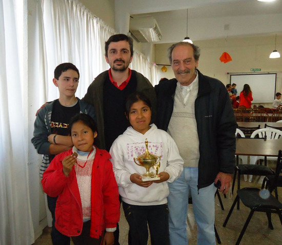 Juan Grassi (Pte. Club Social) y Leandro Guasconi con ajedrecistas campanenses.