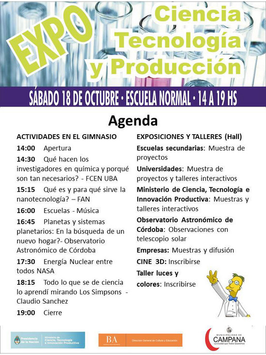 Organizado por la Municipalidad de Campana, por intermedio de su Secretaría de Gabinete, a través de su Subsecretaría de Producción, Turismo, Ciencia y Tecnología, y la Secretaría de Cultura y Educación, hoy sábado se llevará adelante la "Expo Ciencia, Tecnología y Producción", actividad que se concretará en la Escuela Normal, desde las 14 y hasta las 19 horas, con entrada libre y gratuita.