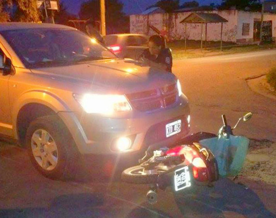 En las primeras horas de la noche de ayer, en la intersección de las calles Córdoba y Namuncurá del Barrio Lubo; un automovil Dodge Journey patente KIO482 colisionó con una moto 110 cc patente 601JRG.
