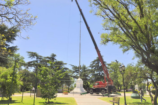 Días pasados, los ocasionales transeúntes pudieron apreciar una grúa de importantes dimensiones trabajando en cercanías del mástil, lugar elegido para el armado del "arbolito".