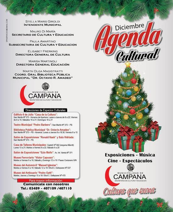 Y la Agenda Cultural del último mes del año no será la excepción. Las diversas Muestras Anuales, Encuentros Literarios. La Danza. Muestra Fotográfica. Y la estelar presentación de la consagrada artista Norma Aleandro son parte de las manifestaciones que la Secretaría de Cultura y Educación, como siempre, de manera libre y gratuita, prepara para todos los vecinos de Campana.