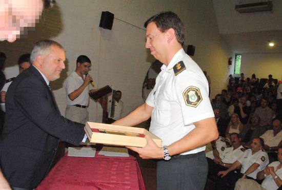 Oficial Principal Matías Córdoba, Jefe del Gabinete Criminologico de la Comisaria Campana, recibe su plaqueta de reconocimiento.