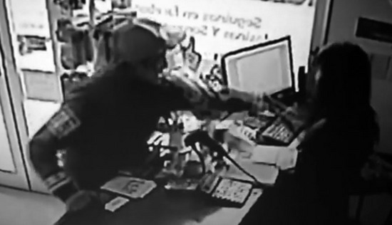CAPTURA DE IMAGEN DEL VIDEO DIFUNDIDO EN FACEBOOK, EN EL MOMENTO QUE UNO DE LOS DELINCUENTES LE APUNTA CON EL ARMA A LA EMPLEADA.