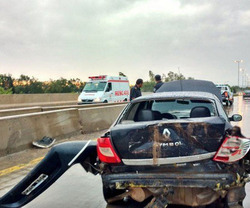 Ayer por la tarde, un Renault Symbol conducido por un remisero oriundo de Zárate que volvía a su casa por Ruta 6 terminó cruzado sobre la calzada cuando, pasando el puente de Tenaris y bajo la intensa lluvia, atravespó por un espejo de agua que le hizo perder el control: terminó chocando contra el guardarrail, quedando sobre el puente del arroyo del barrio San Cayetano.