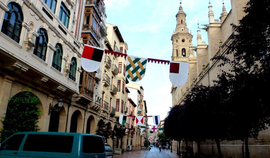 logroño, capital de la provincia de la rioja, se encuentra al margen del rio ebro. aquí en la foto preparada para las celebraciones de san bernabe. al fondo la catedral santa maria de la redonda