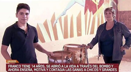 La historia de Franco Ayala superó los límites de la ciudad y llegó al segmento "Grosos" de Telenoche. Tiene 15 años, se recibió de profesor infantil de Danzas y próximamente será Profesor de Bombo. Y ya le enseña a 50 niños en el barrio Del Pino.