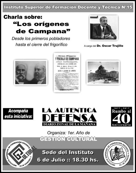 Hoy a partir de las 18:30 en el Instituto 15, el Lic. Oscar Trujillo presenta su charla "Los orígenes de Campana: desde los primeros pobladores hasta el cierre del frigorífico".