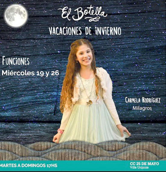 La actriz campanense Carmela Rodríguez estará los miércoles 19 y 26 de Julio en la obra "El botella" que se presenta en el Centro Cultural 25 de Mayo en Villa Urquiza (Av Triunvirato 4444), en la Ciudad Autónoma de Buenos Aires.