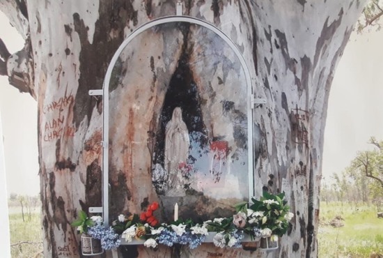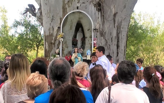 Algunos memoriosos del lugar nos cuentan que desde el año 1940 un sacerdote venía a hablarles de Jesús, daba misa a cielo abierto y en ese árbol clavaba una cruz. Con el tiempo se hizo una herida en el árbol que formó un hueco. Fue en esa rústica ermita donde se colocó la imagen de la Virgen y que ahora es centro de peregrinaciones.