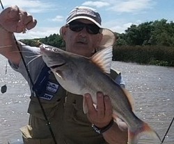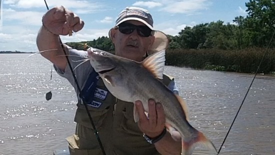 Después de un par de horas decidí cambiar el sector de pesca en busca de otras especies y portes por lo que motor en marcha cruce hacia la costa de enfrente y fondeamos en una profundidad de unos trece a quince metros. Aquí realizando intentos para el lado de la costa lo que más abundaban eran descarnadores o las conocidas marietas, pero en los lances río afuera se dieron las capturas de un bagre blanco que promedio los dos kilos y un par de armaditos de lindos portes, así y todo el pique estaba muy remiso y el sol ya a esta altura era agobiante por lo que se impuso el armado de la toldilla.