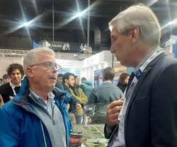 Romano aprovechó la oportunidad para conversar con el Presidente de la UIC, Ing. Ángel López, en el predio de Costa Salguero, que participaba de un evento paralelo.