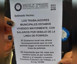 El miércoles y el viernes, los municipales estuvieron repartiendo panfletos en distintos puntos de la ciudad -como la plaza Eduardo Costa y la rotonda del Mc Donald`s- y realizaron reuniones informativas en distintos sectores de trabajo.