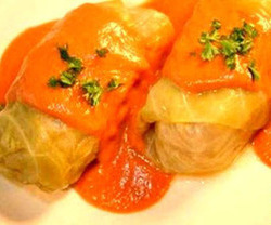 Pasar las hojas de repollo por agua caliente unos segundos para que se ablanden. Cortar las nervaduras duras. Picar la cebolla, el ajo, el morrón, rehogar en aceite, el laurel y la salvia, la salsa casera de tomate o tomate triturado. En un bol colocar la carne, el arroz hervido, el chorizo cortado sin piel, el huevo, el queso rallado, sal, pimienta y pimentón, mezclar bien, que se integren todos los elementos.