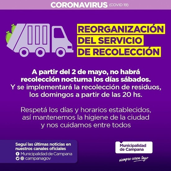Es parte de la reorganización del trabajo de recolección con el objetivo de seguir cuidando la salud del los empleados en la emergencia sanitaria. Pasará a los domingos a partir de las 20. Este viernes no se prestará servicios por el feriado.